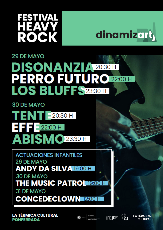La Térmica Cultural en Ponferrada acogerá entre el viernes 29 y el domingo 31 de mayo una nueva edición del Festival Heavy Rock de Dinamiz-ARTj con un cartel que contempla la participación de seis formaciones musicales del género y una programación especial para público infantil. La Fundación Ciudad de la Energía (CIUDEN), entidad dependiente del Ministerio para la Transición Ecológica y el Reto Demográfico (MITECO), impulsa este evento que, tras el éxito de su primera edición, regresa como una cita cultural de referencia.